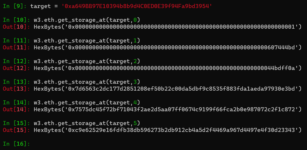 Out[8]: HexBytes('0x0000000000000000000000009b3754c0a0798ade51e98c7a81ae73aacf9c2e5f')