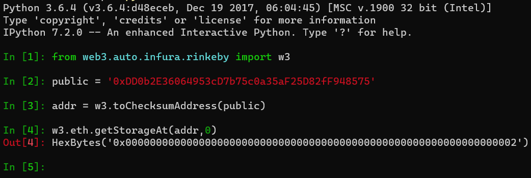 In [8]: w3.eth.getStorageAt(w3.toChecksumAddress('0xDe3CaD19ADcbCC04674FE56B0627C230e7b81f4A'),0)